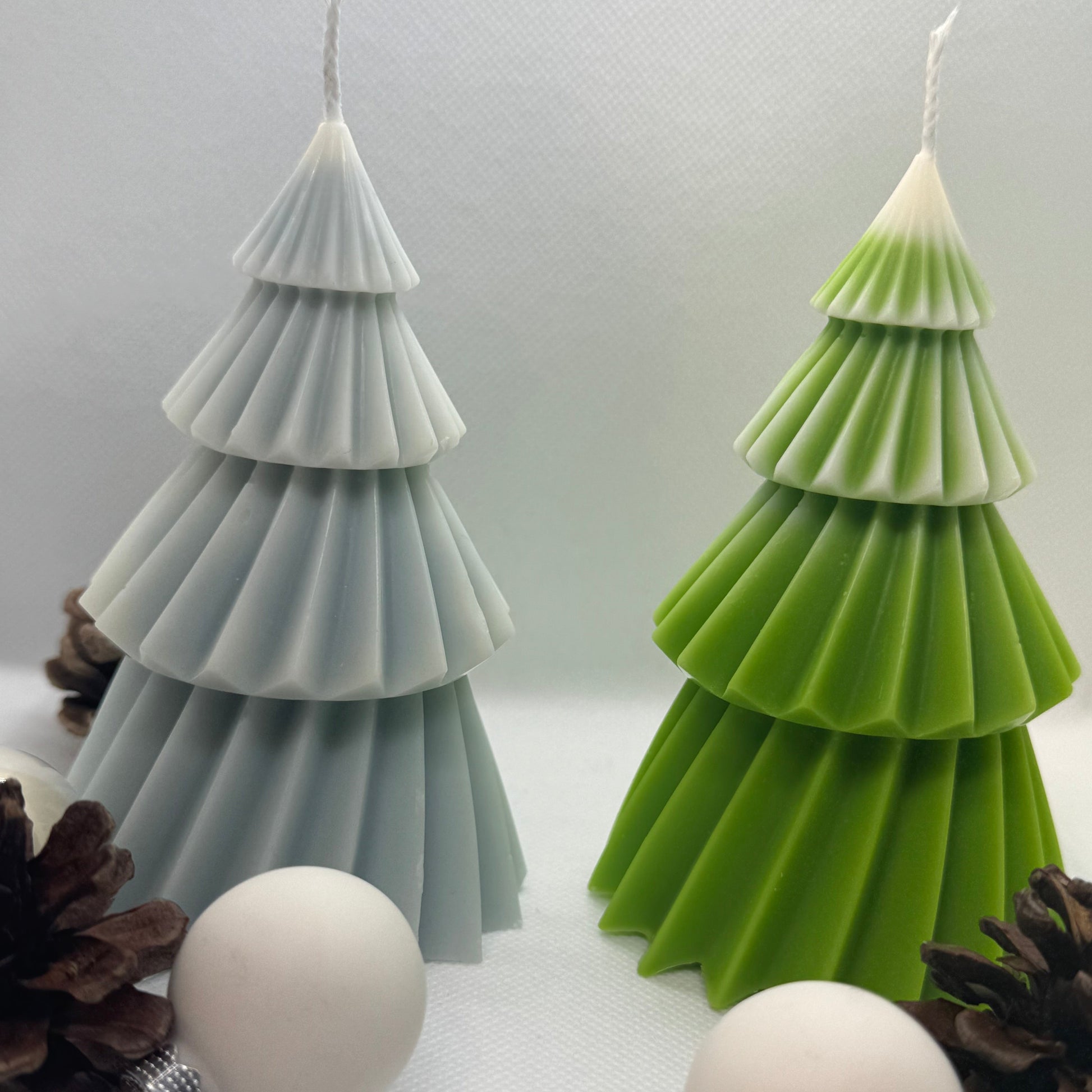 Verleihe deinem Zuhause festliche Stimmung mit unseren handgefertigten Tannenbaumkerzen aus Sojawachs. In zwei winterlichen Farben – ein kräftiges Grün oder ein zartes Blau, beide mit einer eleganten weißen Spitze – verbreiten diese Kerzen den erfrischenden Duft von frischen Tannenbäumen.