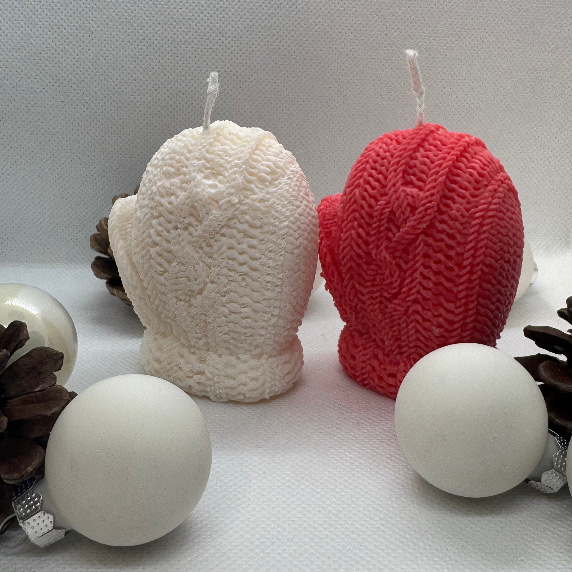 Verleihe deinem Zuhause eine festliche Note mit unseren handgefertigten Handschuhkerzen aus Sojawachs. Diese charmanten Kerzen in den klassischen Farben Rot und Weiß sind mit einem liebevollen Strickmuster versehen und bringen winterliche Gemütlichkeit in jedes Zimmer – ganz ohne Duft.